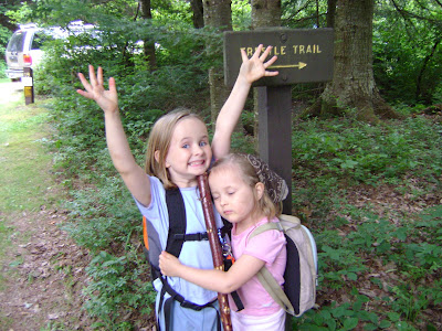 We arrived at the campsite in the early afternoon. There was an unfortunate, intense ten minutes or so of sibling bickering -- you know, meaningful things such as "Stop standing so close to meeeeee" in whiny, earth-shattering screamy volumes. This caused my inner Joan Crawford to pop out...I told the girls that if they didn't knock it off then we would forget about camping and hiking, and just head home. There was great fussing all around, tears, and then finally tender assurances. Eventually we all chilled out and started on our hike. Ah, parenthood.